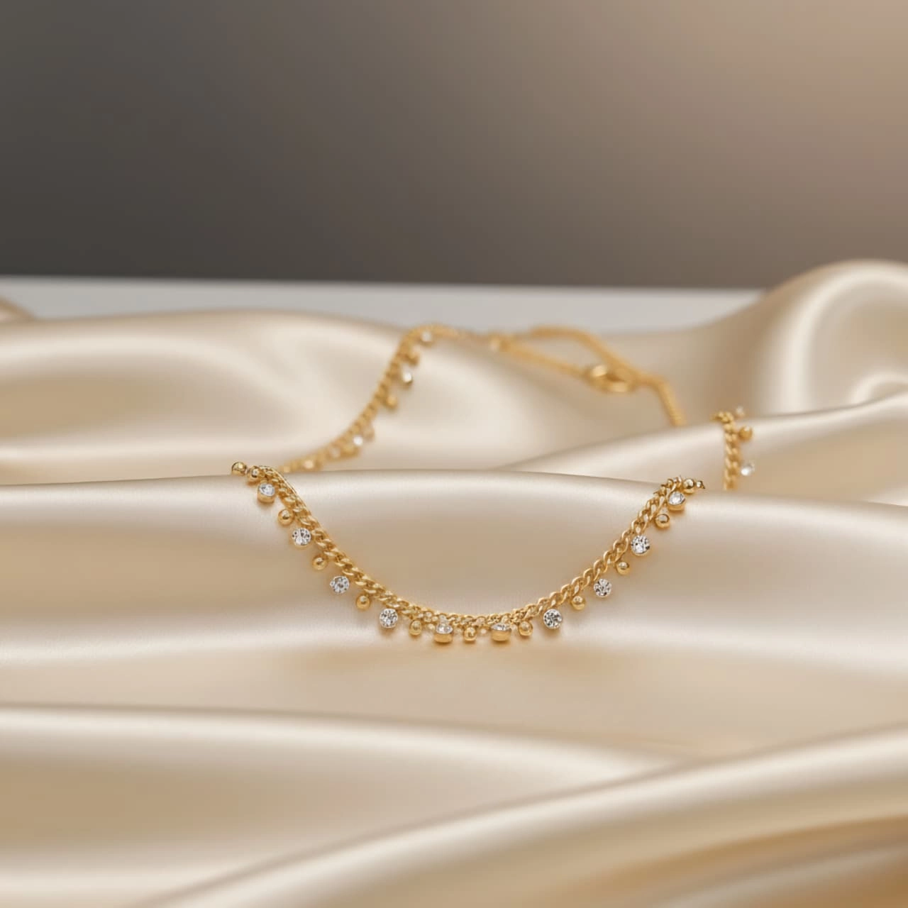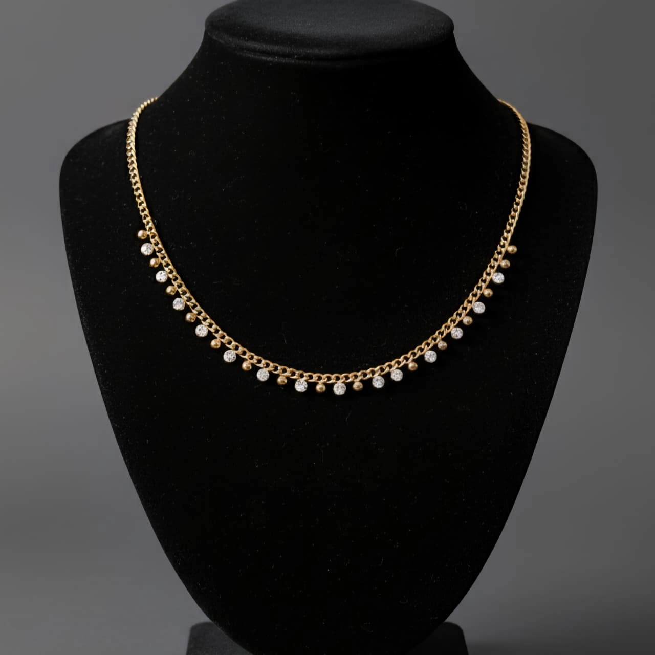 Elegant Gem Drop Necklace, a premium design featuring shimmering gems on a durable 18K Gold PVD Coated 316L Stainless Steel chain. Enjoy its anti-tarnish, waterproof, and hypoallergenic qualities, ensuring it’s always skin safe.